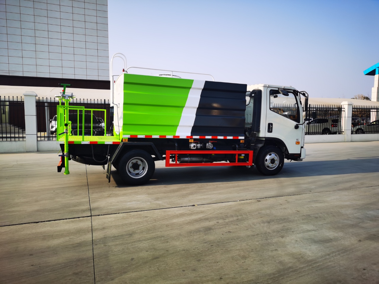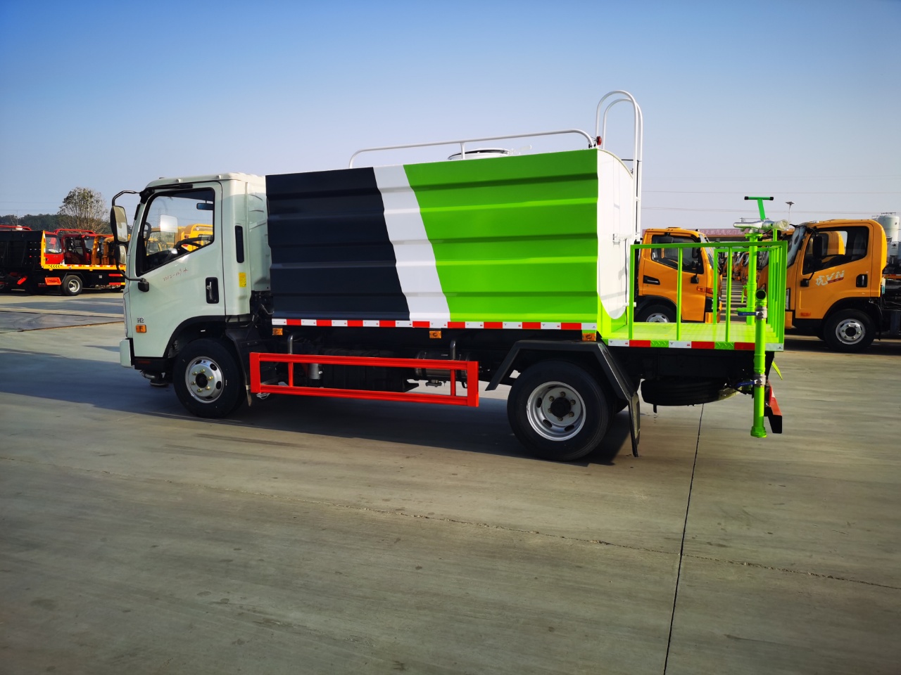 方形罐體,多款樣式可選,罐體容積7.4立方,采用億豐優(yōu)質(zhì)40/50灑水泵,全車不銹鋼大通徑球閥,灑水車功能,前沖,后灑,側(cè)噴,帶工作平臺(tái)。高炮360度旋轉(zhuǎn),可調(diào)節(jié)成大雨,小雨,霧狀,柱狀,帶隨車工具,帶兩根等長的2.5米抽水管,帶電邊燈,其他標(biāo)配。尾部超大平臺(tái)。帶霧炮和不帶霧炮均可包上藍(lán)牌!