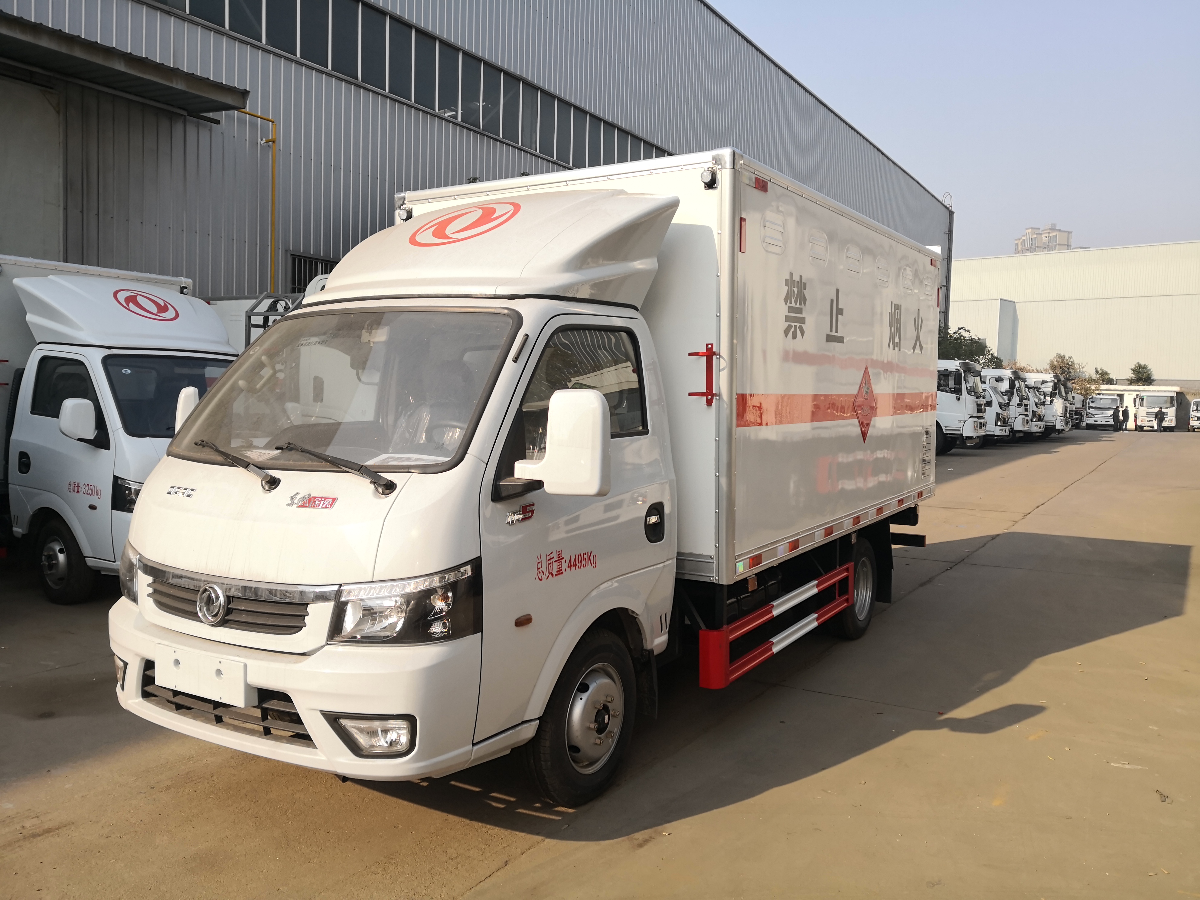 【廂體配置】整車尺寸:5430×1800×2700,箱體尺寸:3300×1700×1700,廂體為雙層金屬結構,外板采用靜電屏蔽效應的冷軋鋼板,中間附以 B1 級阻燃泡沫,內飾采用鋁板,內部采用金屬骨架,廂體內四周采用鋁材壓邊,廂內兩側上方安裝防雨通氣孔。底板為防 滑花紋板3mm(上鋪設防靜電膠皮),廂體右側開一個單開側門,鎖為鍍鋅鎖件,廂內安裝固定運載物的臥環(huán),貨箱內部帶防燃煙霧報**器,門框加裝防盜報**感應器。整車國標反光標示及**告標志 (隨車工具,滅火器,三角頂燈,危險品標識,拖地靜電帶),其他按 照公告標準制作。