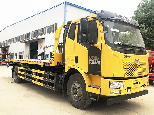 國六黃牌解放J6平板一拖二清障車