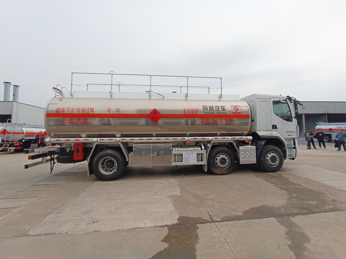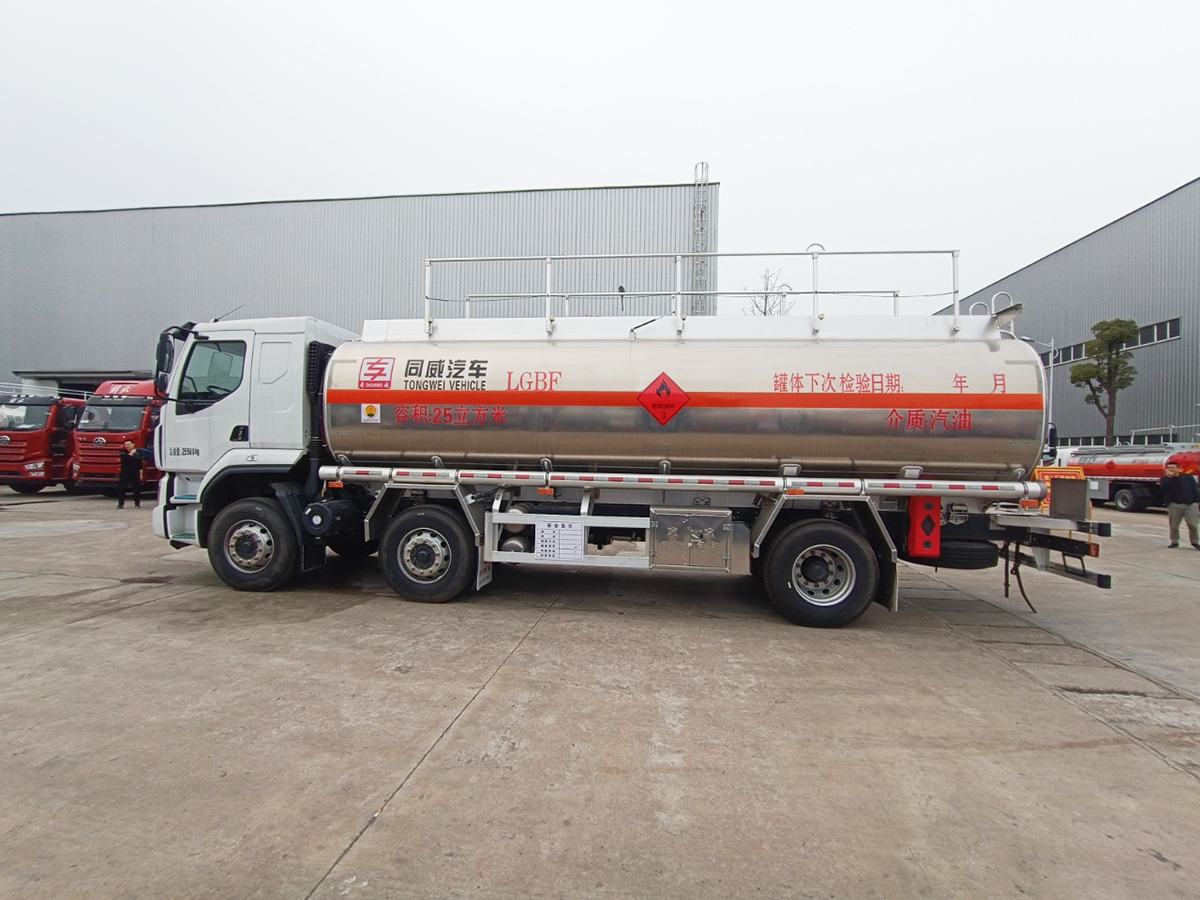 柳汽小三軸鋁合金柴汽雙介質(zhì)罐體為21.5方,汽油介質(zhì)為25方,總質(zhì)量25500,陜齒8檔.H51S駕駛室,軸距2050+4050,玉柴270,8JS105TA,Ф430離合,5.5T盤式前橋,后橋440/4.444/加寬制動(dòng)器,板簧3/3/-,282(8)車架,400L鋁合金油箱,國(guó)產(chǎn)方向機(jī),輪胎12R22.5,前機(jī)械后氣囊駕駛室懸置、電動(dòng)液壓翻轉(zhuǎn)、夾層玻璃、電動(dòng)玻璃升降器、機(jī)械減震司機(jī)座椅、電磁離合風(fēng)扇、LCD液晶儀表、MP3+收音機(jī)、自動(dòng)空調(diào)、定速巡航系統(tǒng)、國(guó)產(chǎn)閥、車載終端(行駛記錄儀+兼容北斗GPS)、外部遮陽(yáng)罩、鋁合金貯氣筒、中控鎖、自動(dòng)調(diào)整臂、多態(tài)開(kāi)關(guān)、真皮多功能方向盤、右轉(zhuǎn)提示音響、前置排氣管、前輪防爆胎裝置、盤式前橋、排氣火花熄滅器、危險(xiǎn)品運(yùn)輸頂燈、ECU限速裝置(限速80km/h)、駕駛室電源總開(kāi)關(guān)、導(dǎo)靜電橡膠拖地帶、T-BOX、EBS、TPMS、LDWS、危險(xiǎn)品專用底盤。